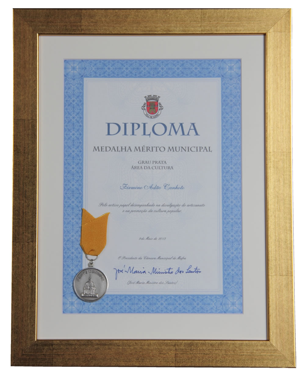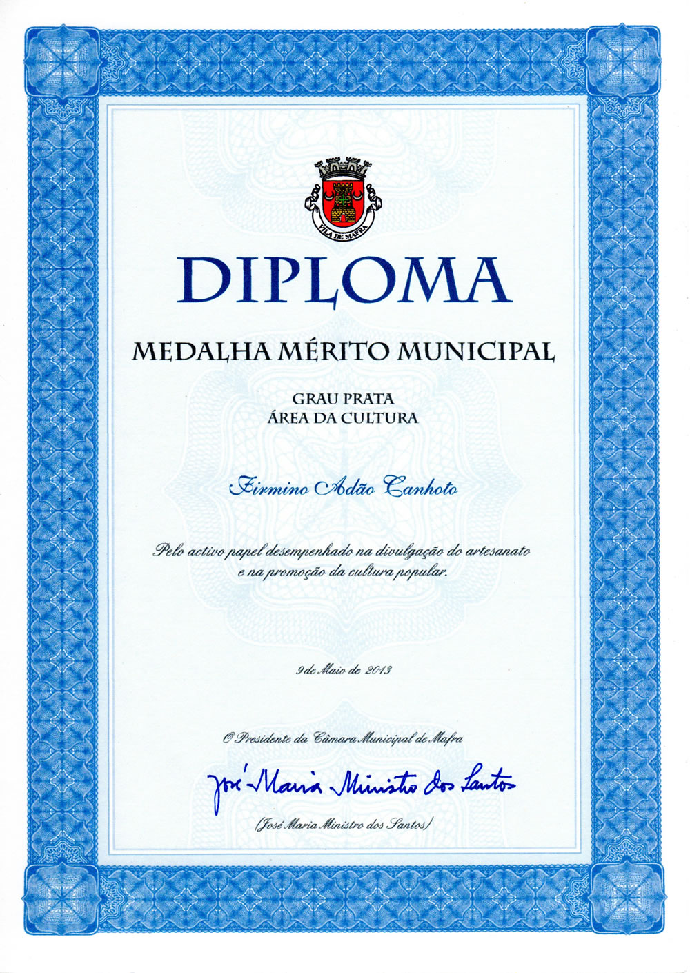 Veja o vídeo da cerimónia aqui. O discurso: Firmino Adão Canhoto começou a trabalhar aos 11 anos de idade, com o seu Mestre José Clímaco. Aos 18 anos estabeleceu-se por conta própria, executando peças de mobiliário artístico e criando, em simultâneo, os seus próprios modelos, não só na área do mobiliário, mas também no fabrico e restauro de instrumentos musicais de corda. Em 1979, transferiu o seu atelier para o Livramento, freguesia da Azueira. A originalidade da sua produção artesanal associada à arte do embutido e da marcenaria artística foi distinguida com a atribuição de diversos prémios, entre os quais a denominação de "melhor construtor de móveis de arte" pelo Ministério para a Qualificação e o Emprego. Destaca-se, ainda, pela participação nas mais variadas exposições internacionais, feiras da especialidade e seminários, para além de inúmeras referências na imprensa e na televisão. Contribuindo para perpetuar a sua arte, tem vindo a desempenhar, igualmente, as funções de docente, como por exemplo na Escola Profissional de Recuperação do Património Edificado, em Sintra, na Escola Superior de Conservação e Restauro, em Lisboa, sendo também convidado pela Fundação Ricardo Espírito Santo Silva, para leccionar no Instituto das Artes e Ofícios, em Lisboa. Esta dinâmica profissional é conjugada com uma activa participação na vida social da sua freguesia e do Concelho de Mafra: no associativismo, enquanto fundador e membro do Grupo de Teatro "Os Incríveis da Aboboreira", da Associação Musical Nossa Senhora do Livramento e da Associação de Ex-Combatentes da Freguesia da Azueira; na divulgação da música popular portuguesa, fundador dos grupos "Recorda é Viver", "Solidó", "Renascer" e "Os Cavaquinhos do Oeste"; e também na imprensa local, como correspondente do jornal "O Carrilhão". Desenvolve, ainda, uma estreita colaboração com a Câmara Municipal, sendo presença assídua em acções de promoção turístico-cultural do Concelho. Face ao exposto, homenageando o seu talento ao serviço da divulgação do artesanato, proponho a atribuição da Medalha de Mérito Municipal, Grau Prata, na área da cultura, a Firmino Adão Canhoto. Mafra, 8 de Maio de 2013.